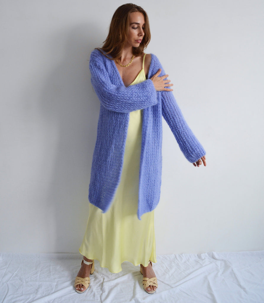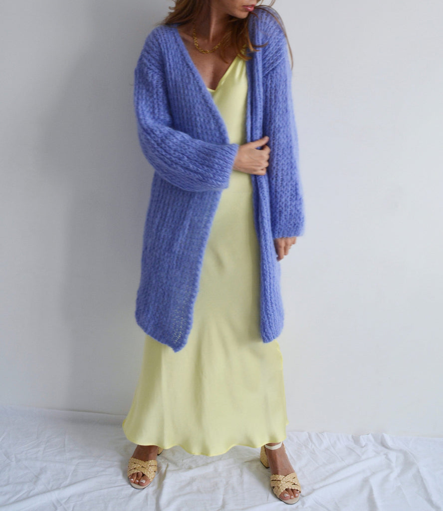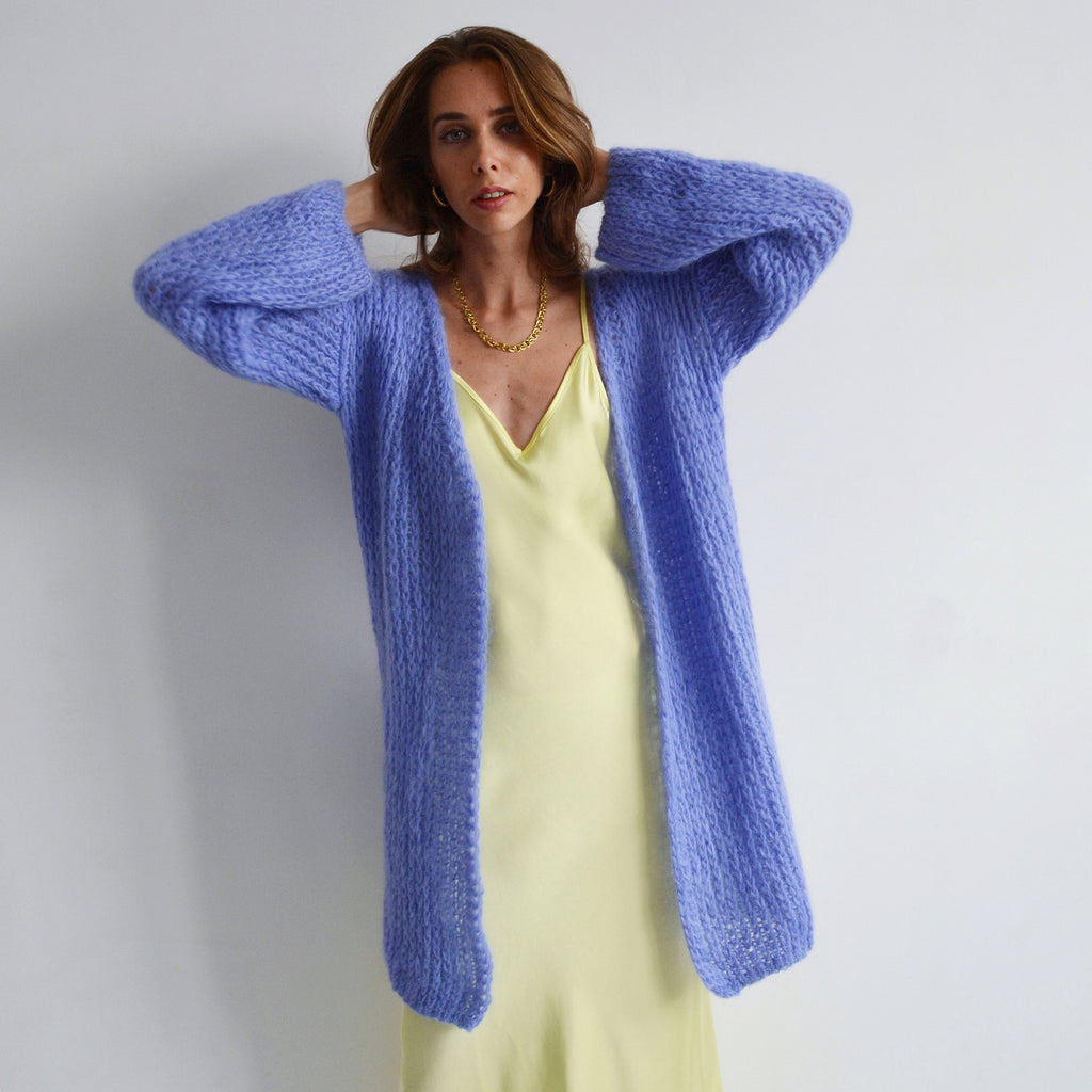 Blue purple mohair thick cardigan, Open long sleeve cardigan, Handknit long cardigan, Wool spring bohemian cardigan