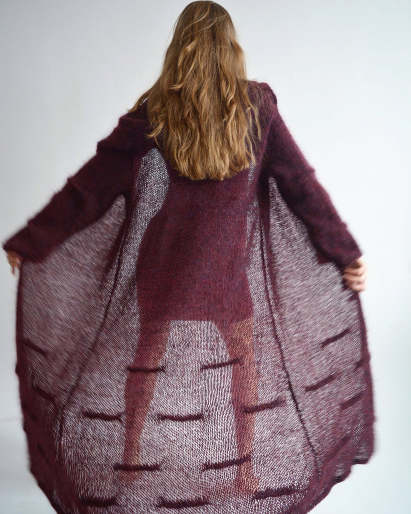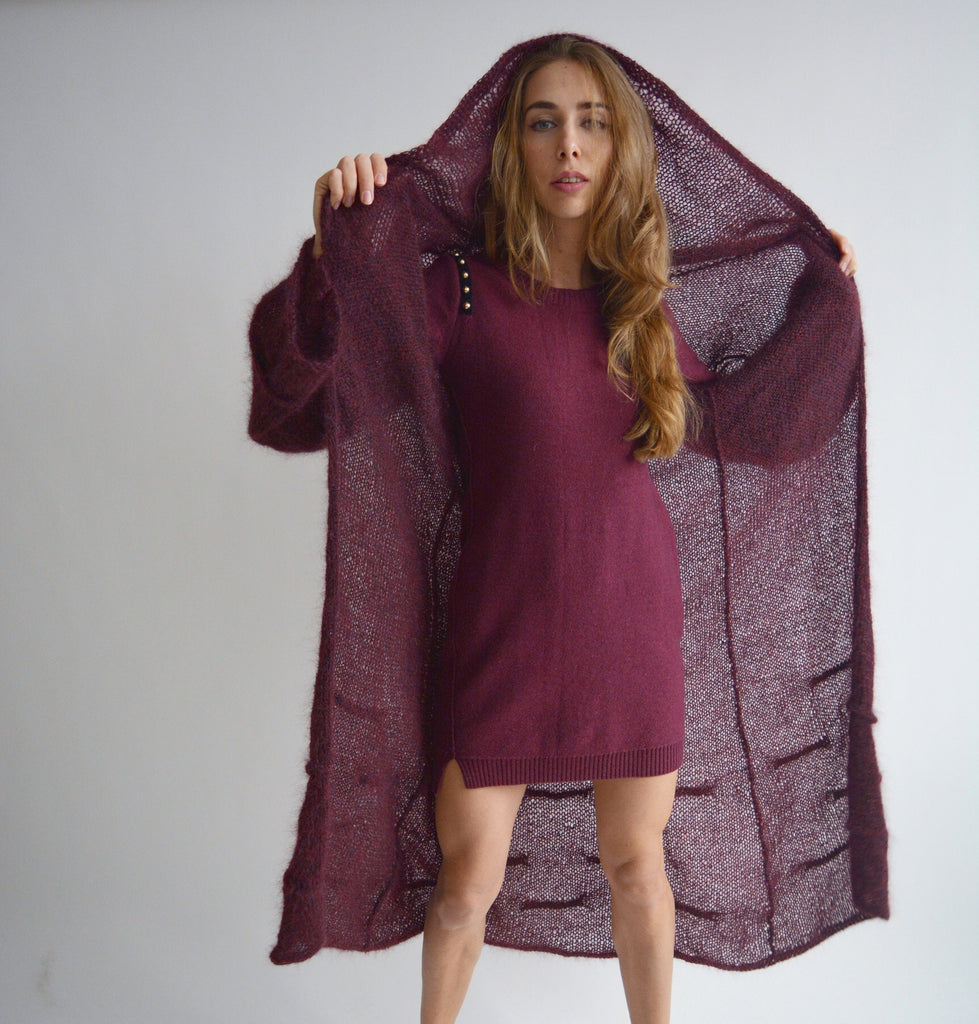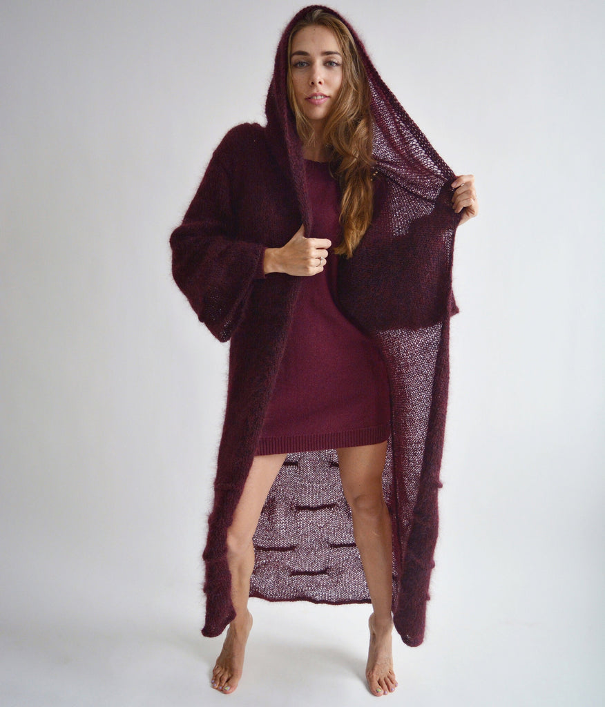 Burgundy hooded long cardigan, Mohair loose knit cardigan, Bordeaux maxi cardigan, Bohemian knitted coat, Oversize thick cardigan