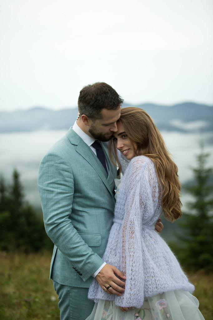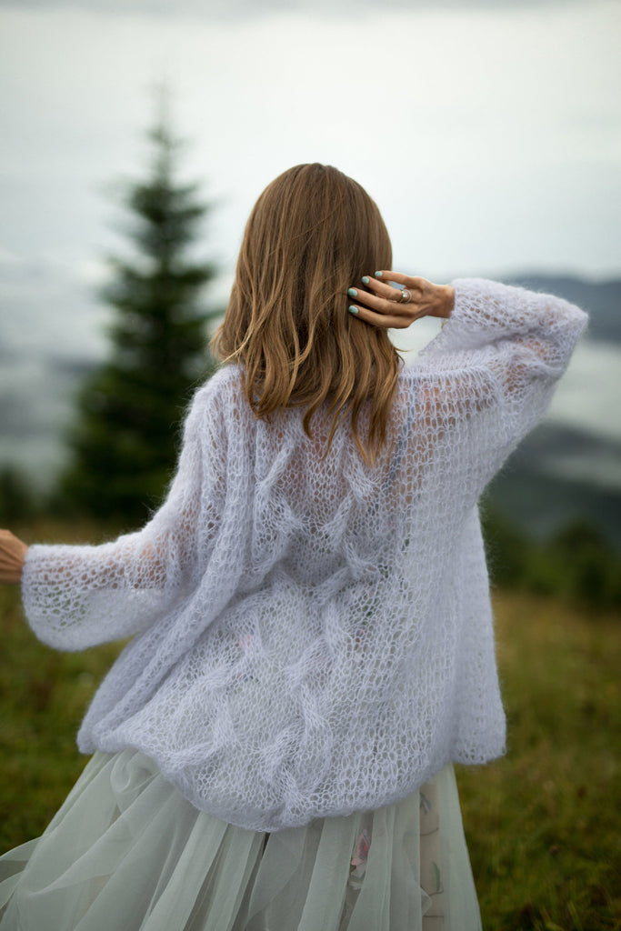 Gray purple bridal cardigan Short mohair cardigan Wedding belted cardigan Cropped bridal cape Knitted light cardigan Wrap chunky cardigan