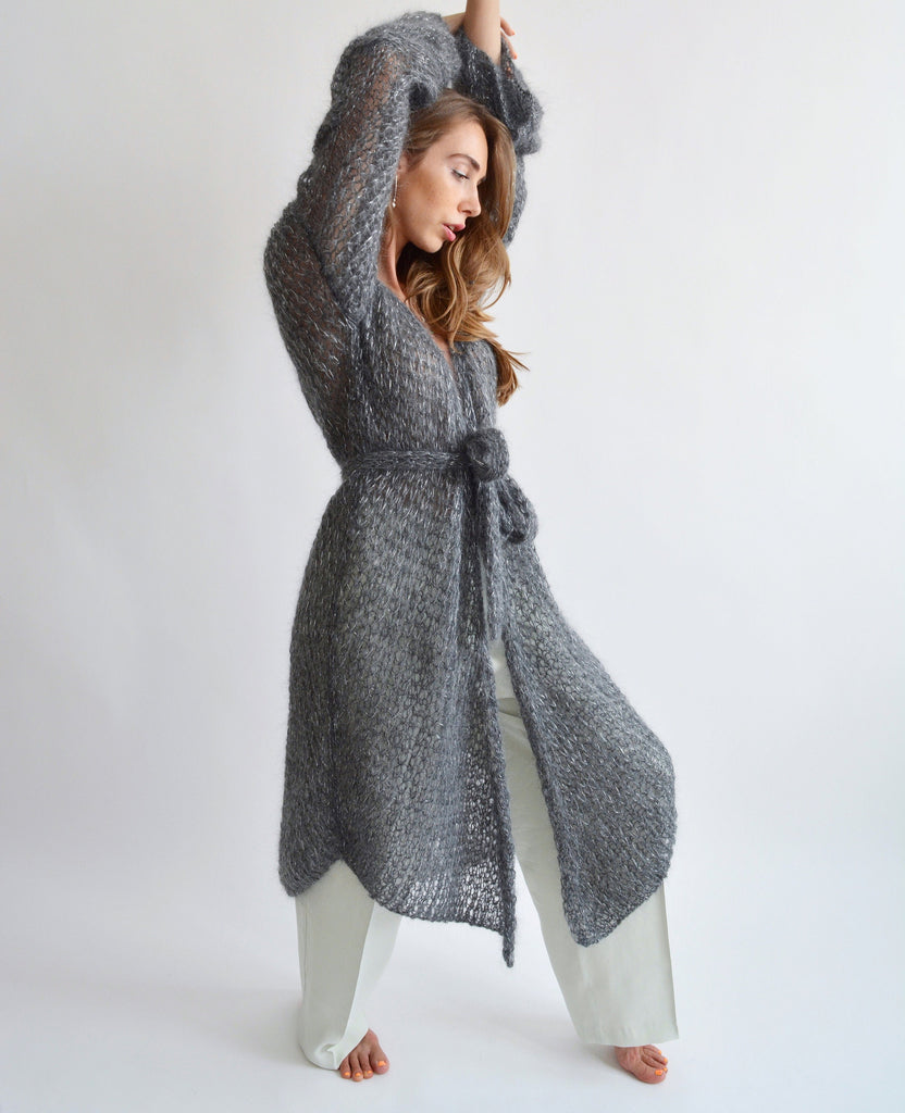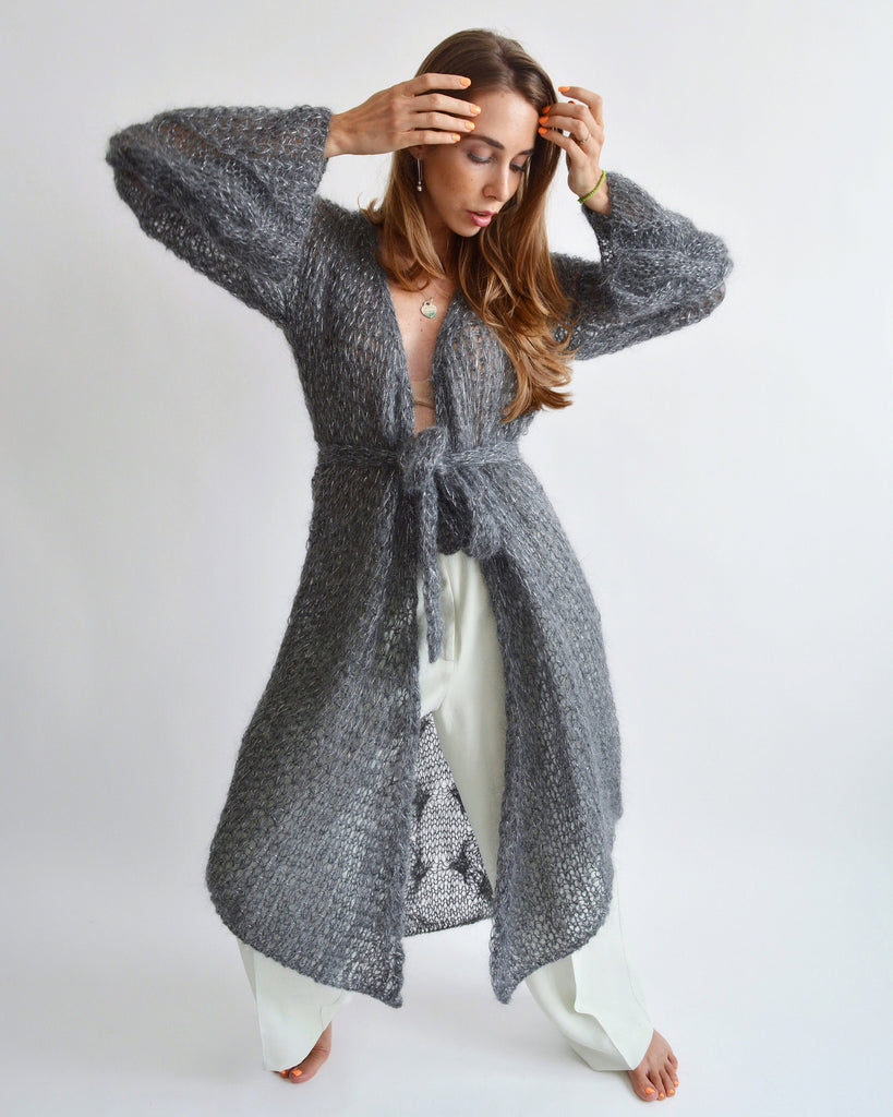 Gray silver mohair cardigan Lurex knit cardigan Long kimono cardigan Wrap maxi cardigan Loose handknit cardigan Boho belted cardigan