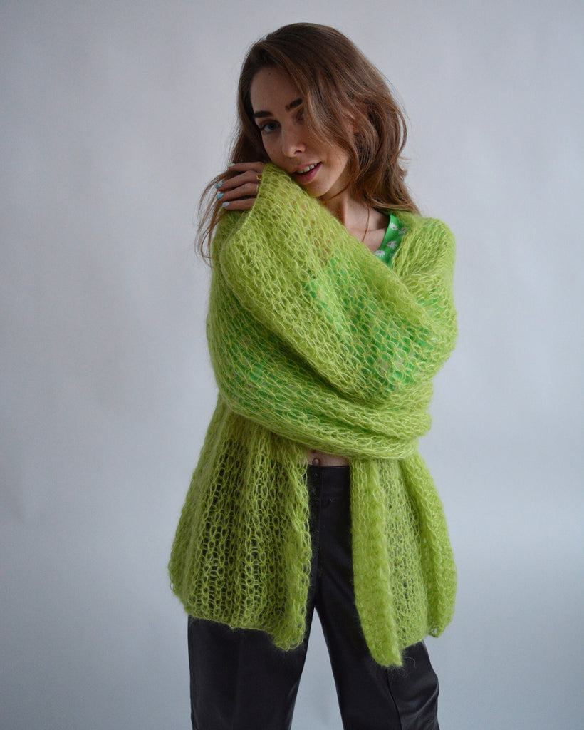 Lime green silk mohair cardigan Short oversized cardigan Soft chic cardigan Cropped knit cardigan Elegant loose cardigan Sexy cardigan