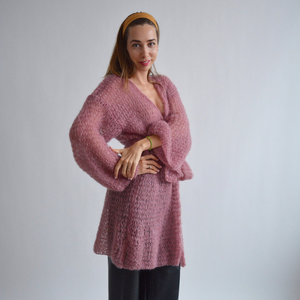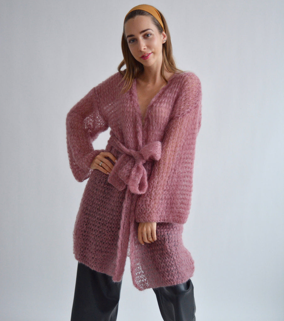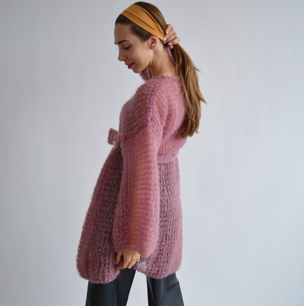 Mauve mohair cardigan Light rose gold cardigan Belted handknit cardigan Wrap wool cardigan Sexy loose cardigan Long oversized cardigan