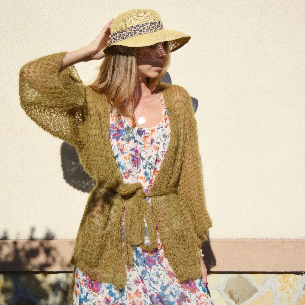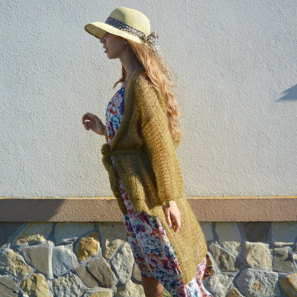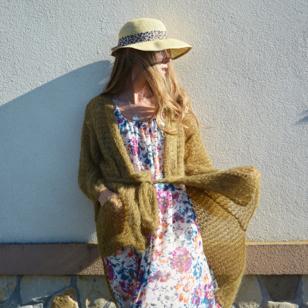 Mustard mohair cardigan Brown asymmetric cardigan Long cardigan with pocket Light cardigan Gold cardigan Boho cardigan Summer cardigan