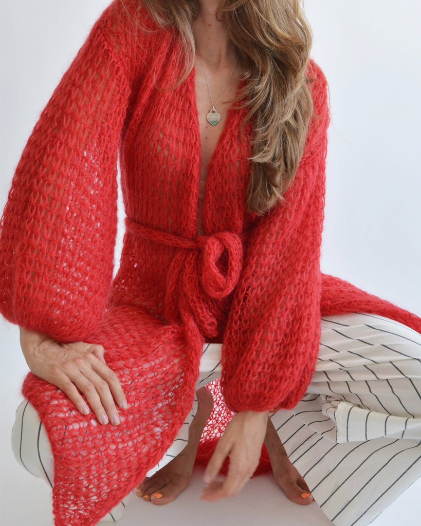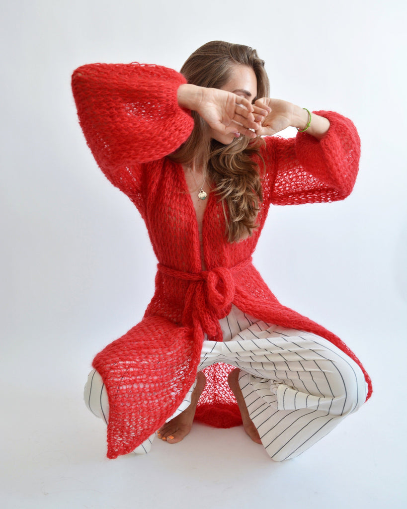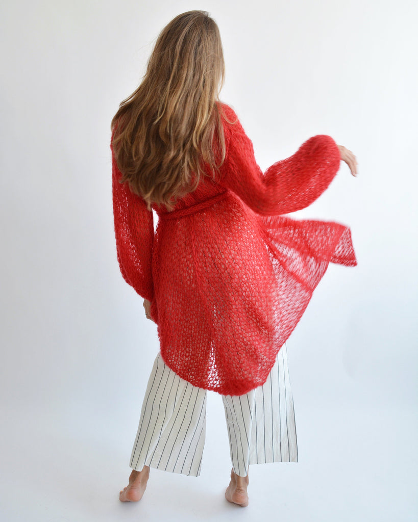 Red mohair asymmetric cardigan, Long kimono cardigan, Wrap belted cardigan, Chunky knit cardigan, Summer bohemian cardigan, Sexy cardigan