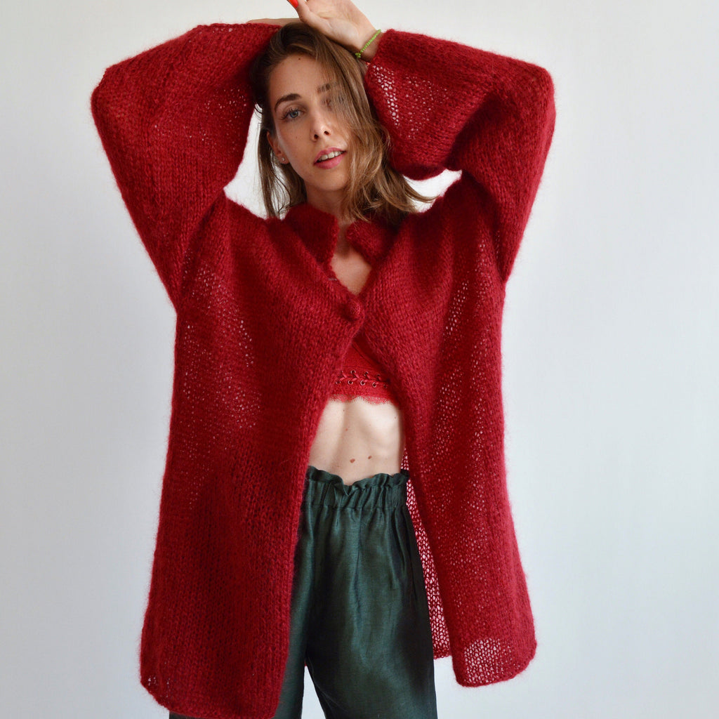 Red mohair cardigan Buttoned long cardigan Thick warm cardigan Handknit wool cape Kimono chunky cardigan Chic extravagant cardigan