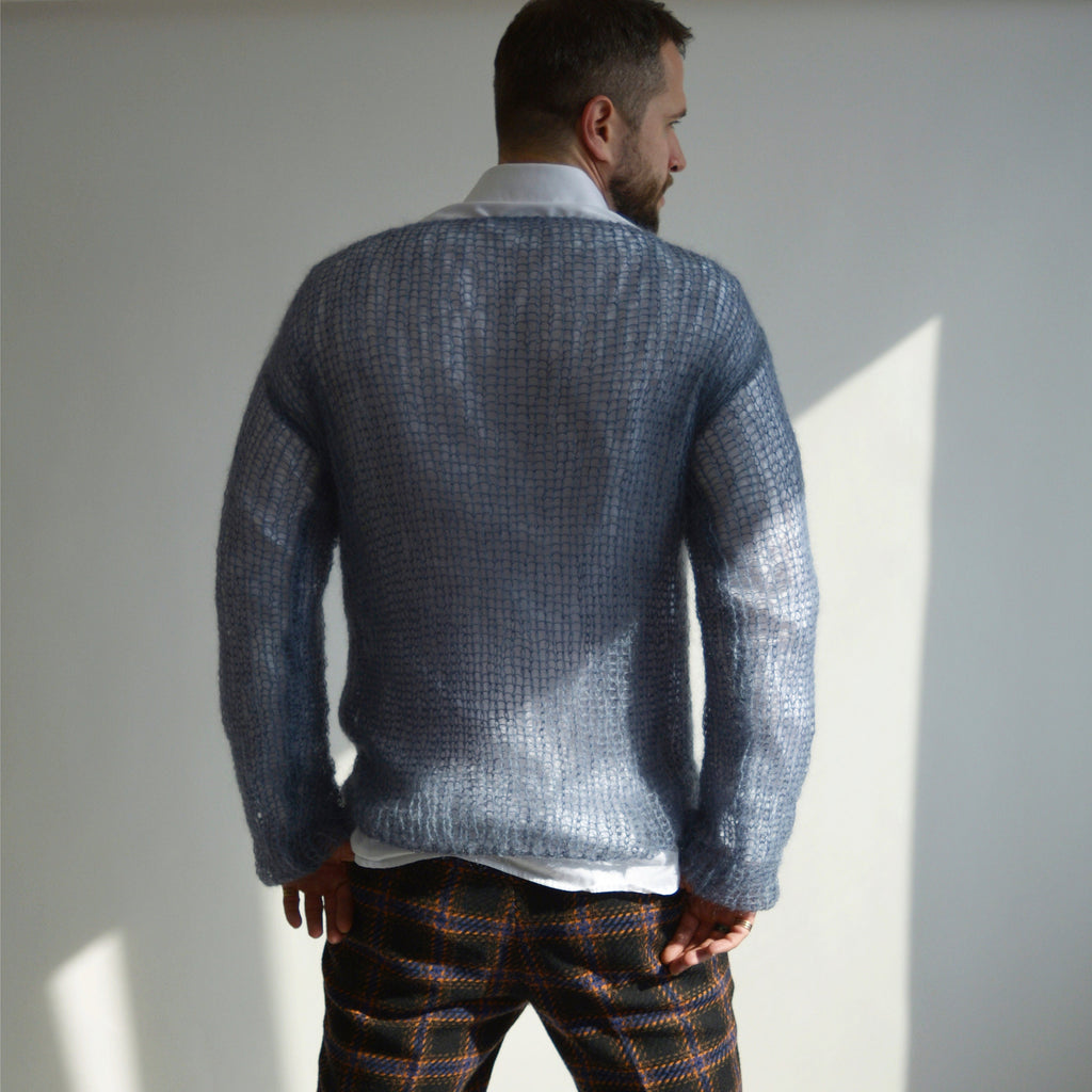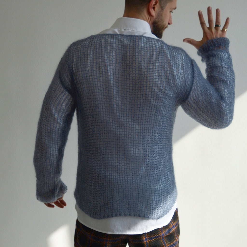 Blue gray mens sweater Handmade mohair sweater Knitted basic men's jumper Christmas gift for him Stylish light men's pullover