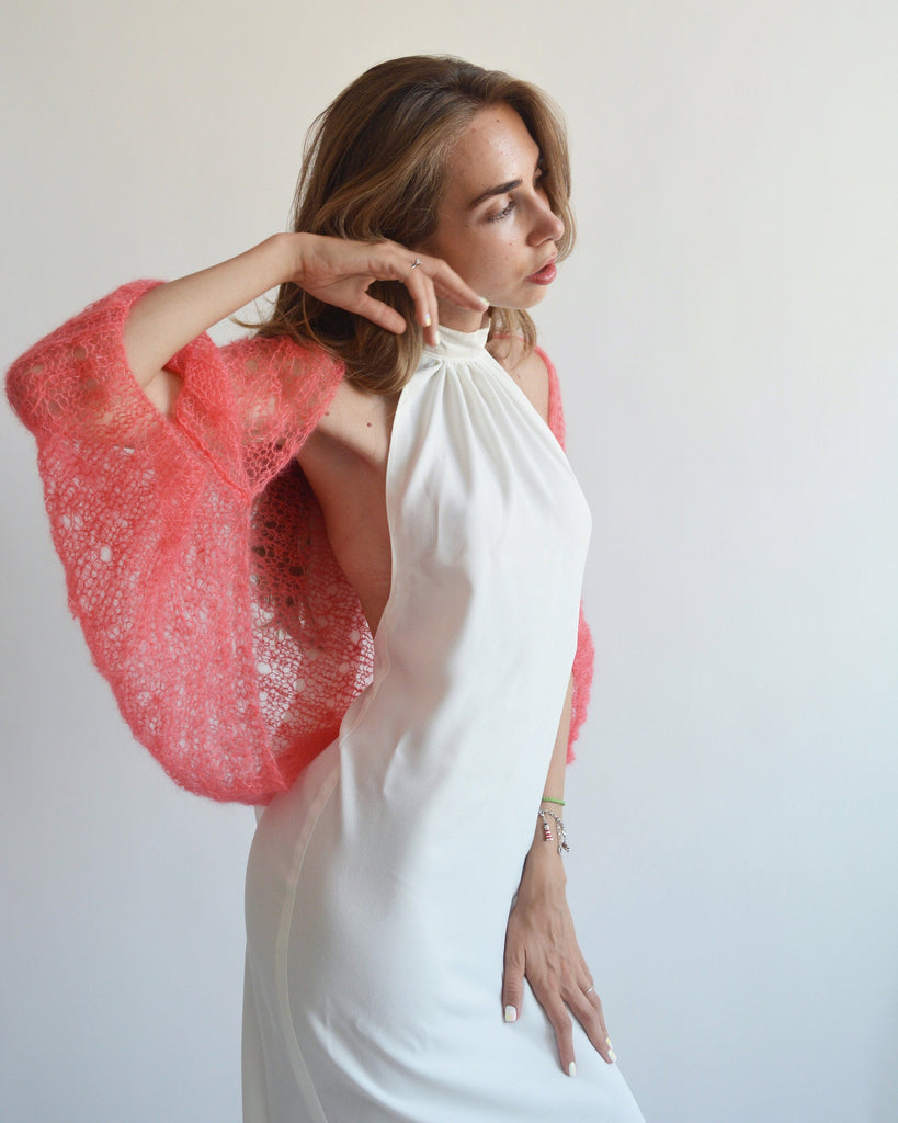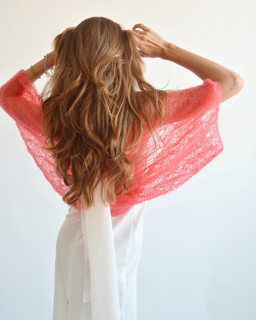 Coral silk mohair shawl, Wedding bolero shrug, Bridal knitted shawl, Evening shawl, Bridesmaid light bolero, Bridal cover up, Bridal wrap