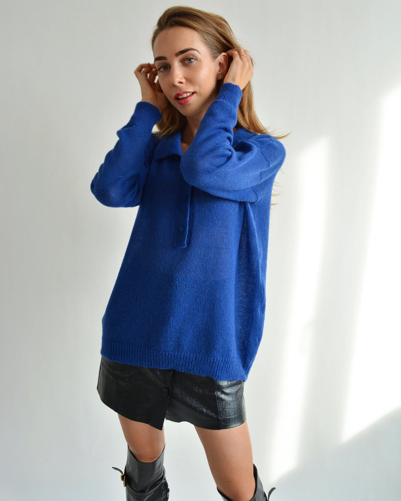 Blue cobalt alpaca sweater Polo shirt merino wool sweater Polo style collared sweater Wool trendy sweater Stylish soft sexy sweater
