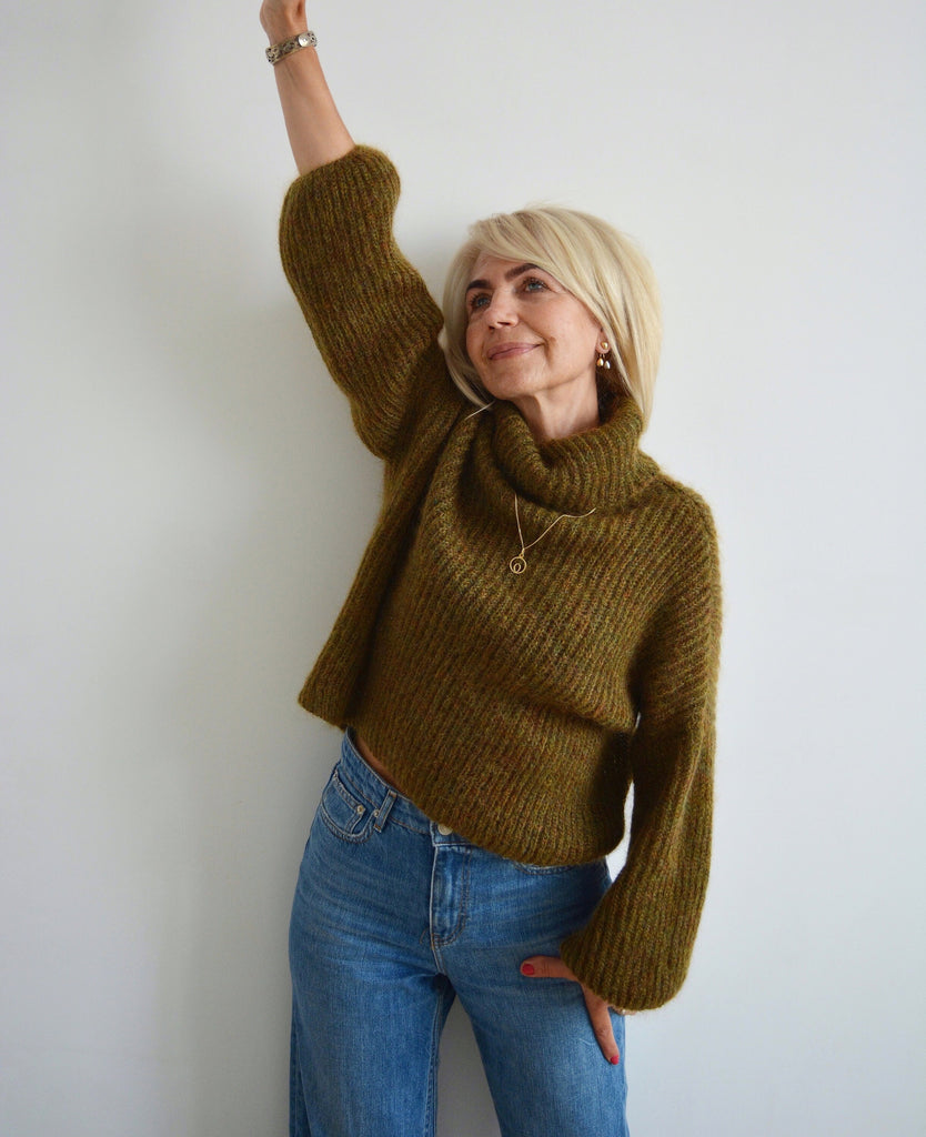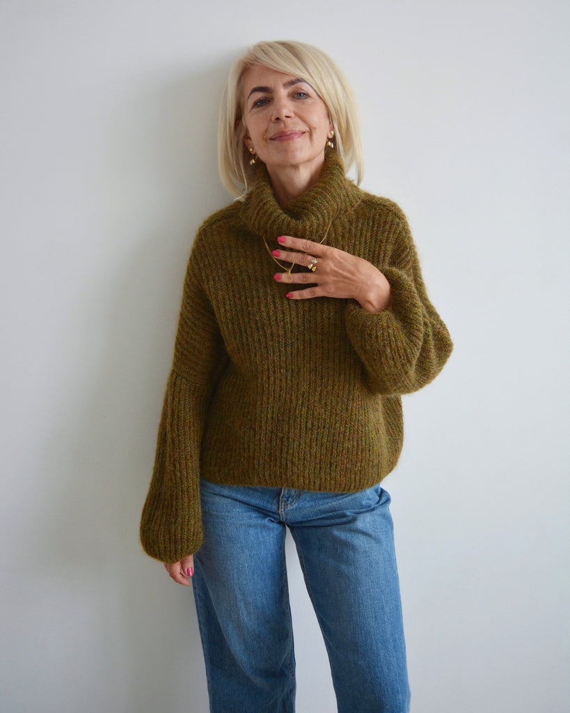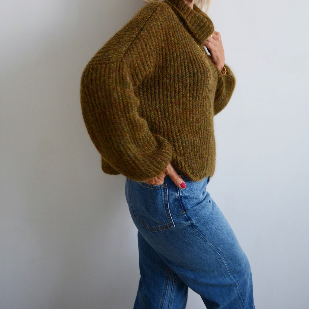 Green khaki mohair turtleneck sweater, Olive loose knit sweater, Thick handknit wool sweater, Oversize warm chunky sweater