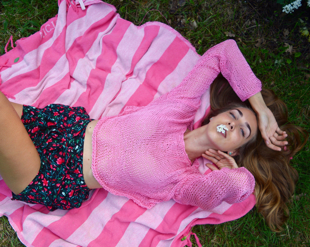 Pink cropped sweater Cotton short sweater Hand knitted summer sweater Light bright sweater Loose sweater Beach sweater