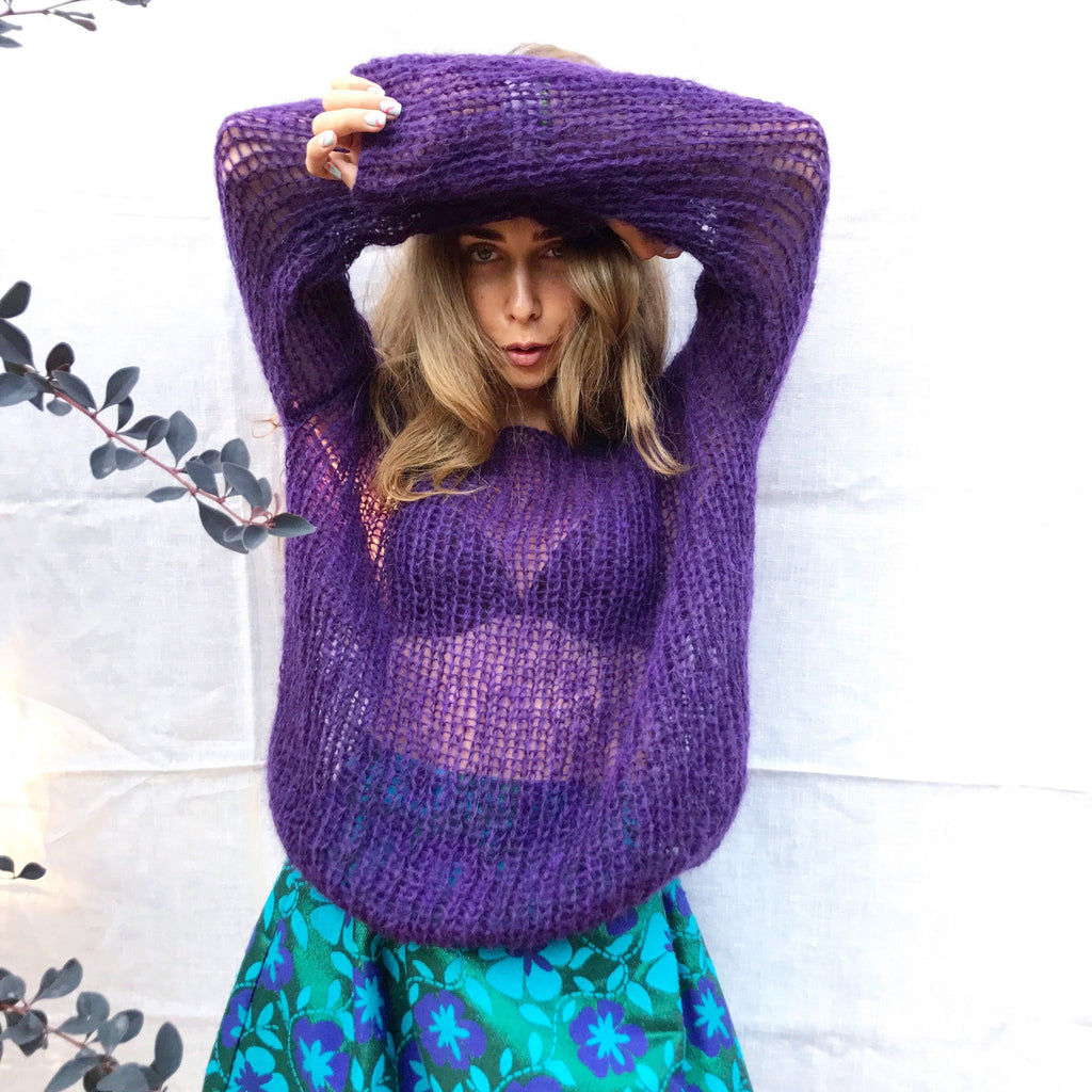 Purple light mohair sweater Sexy off shoulder sweater Loose knit spring sweater Oversized wool knit sweater Handknit wool basic sweater
