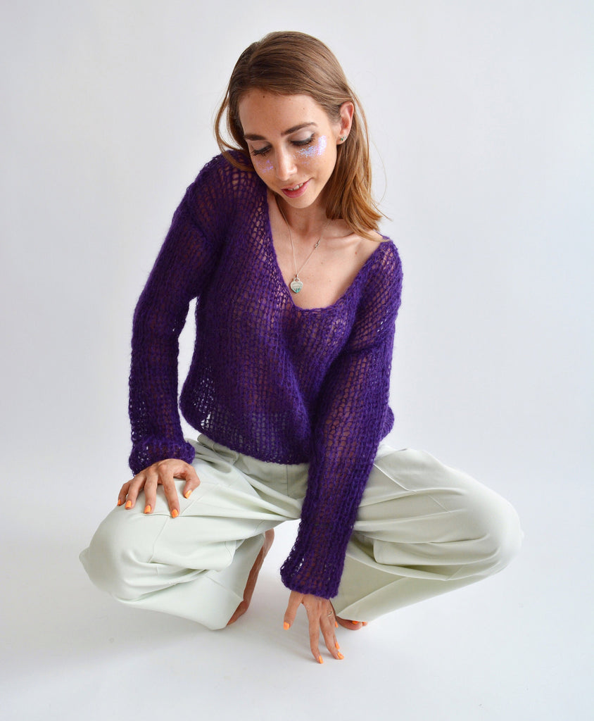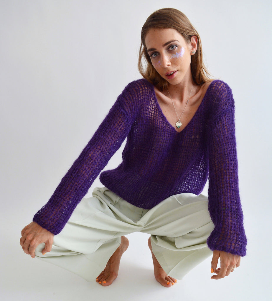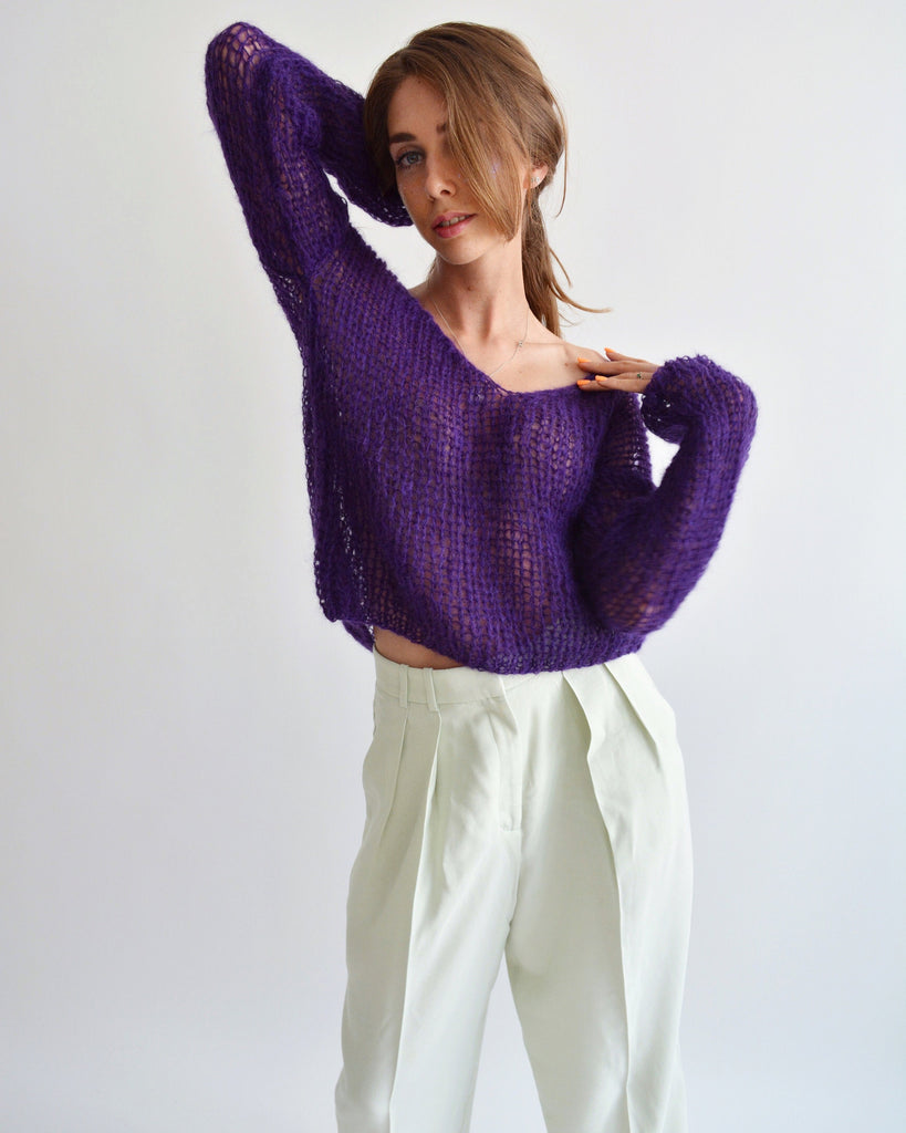 Purple v neck mohair sweater Light loose knit sweater Handknit sexy sweater Cropped summer sweater Bohemian short sweater