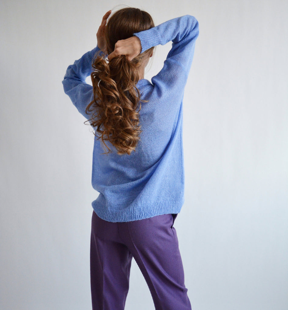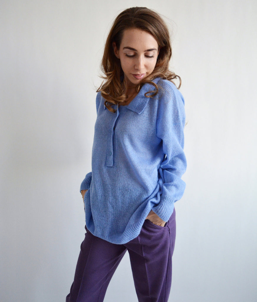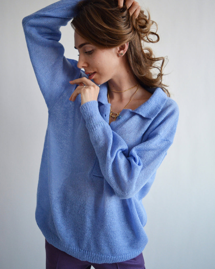Blue knitted polo shirt Bright collared sweater Merino wool sweater Polo style sweater Chunky alpaca sweater Buttoned sweater Retro sweater