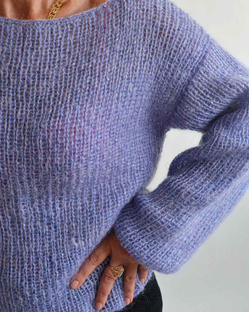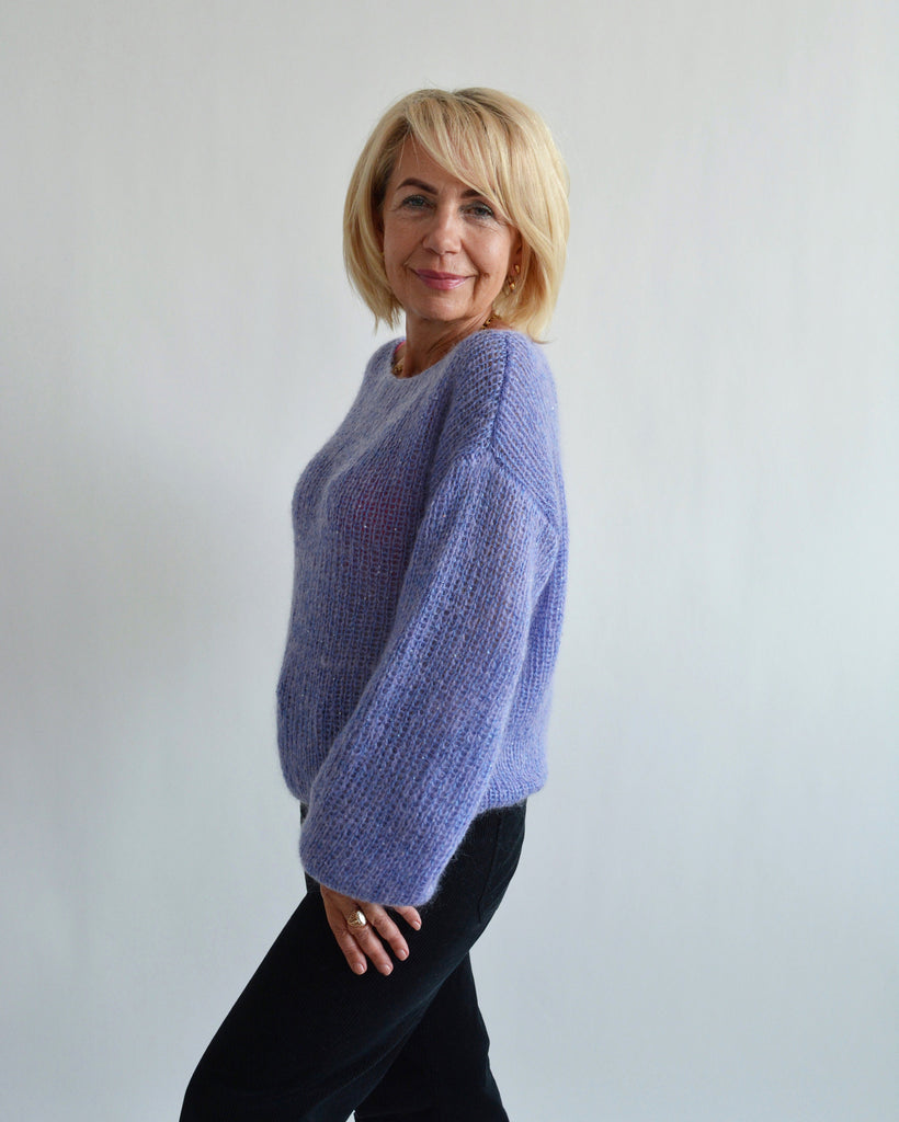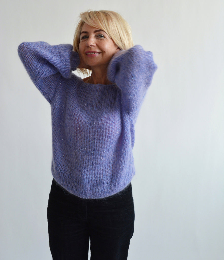 Blue mohair sweater with paillettes Embroidered purple wool sweater Embellished handknit sweater Beautiful sexy sweater Unique shiny sweater