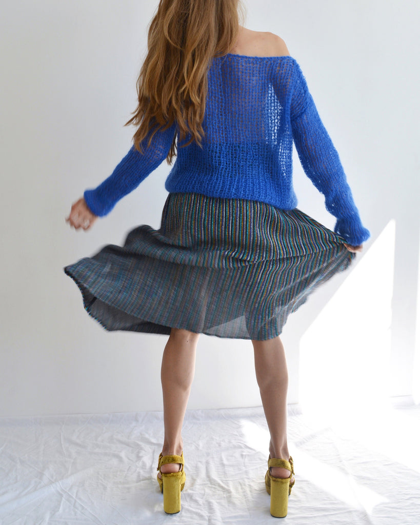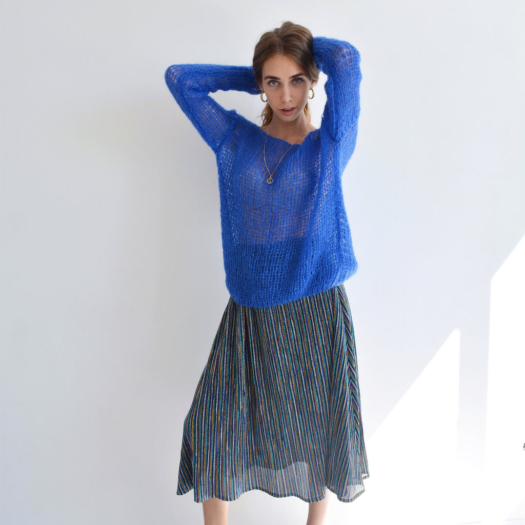 Electric blue mohair sweater Off shoulder oversized sweater Light sexy sweater Handknit soft sweater Bohemian wool sweater
