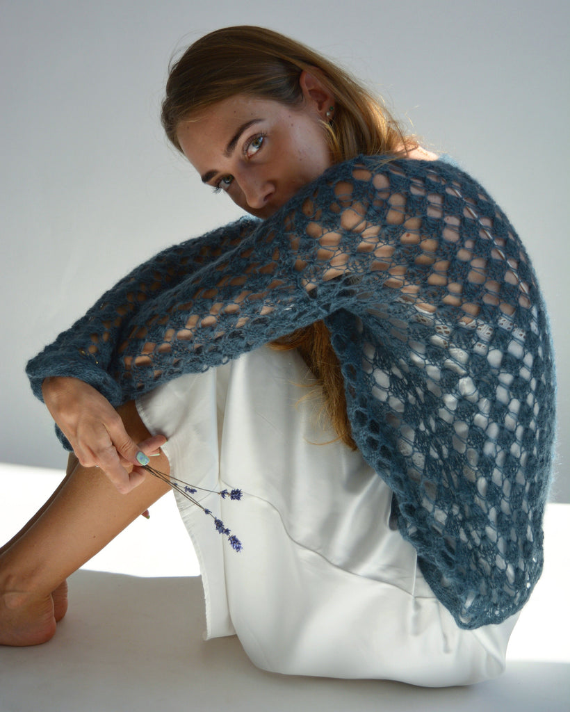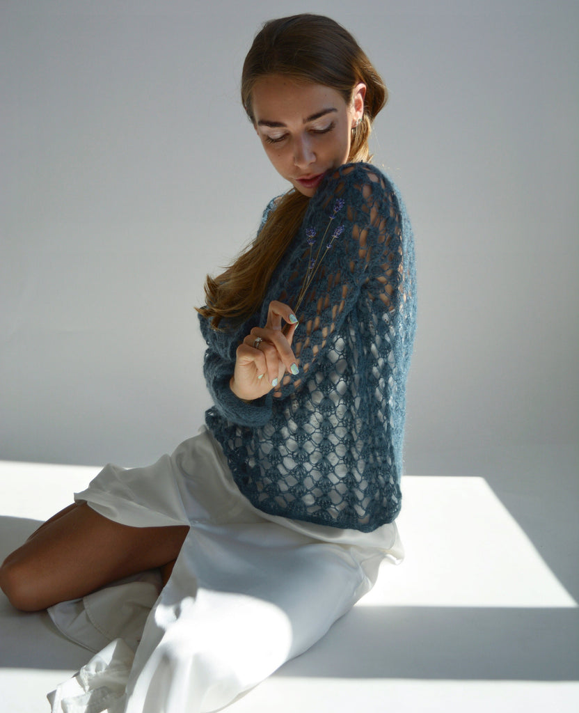 Gray blue mohair sweater Light mesh sweater Crochet sexy sweater Hand knitted unique sweater Chunky bohemian sweater See through pullover