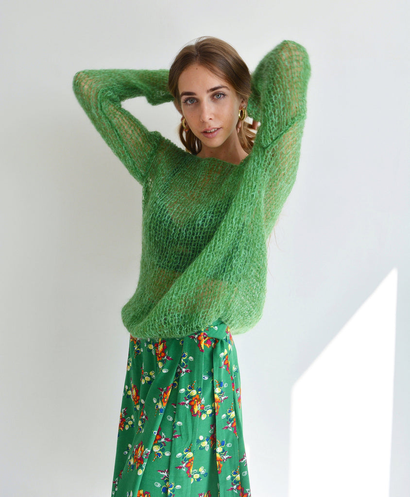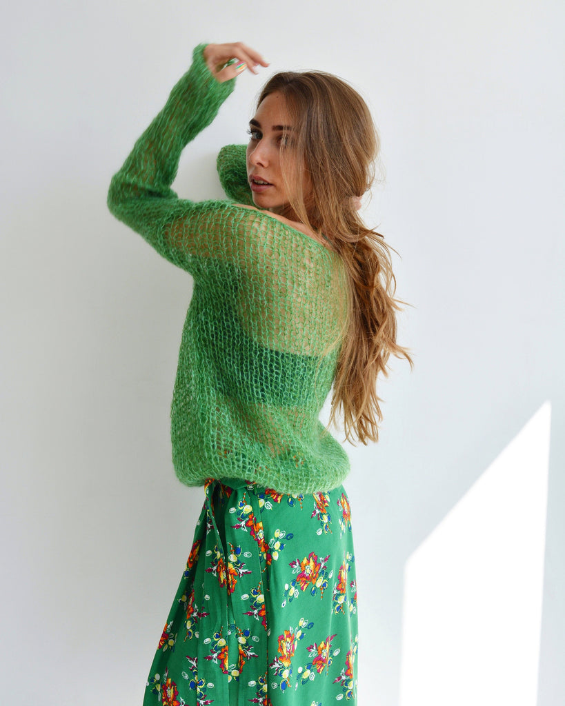 Green mohair sweater Off shoulder light sweater Handknit loose sweater Oversized spring sweater Bright basic sweater Chunky sweater