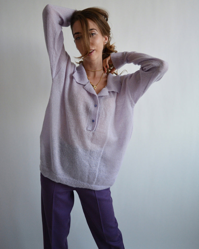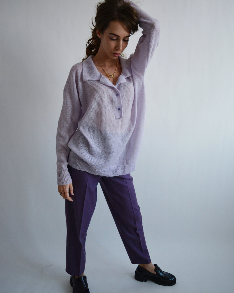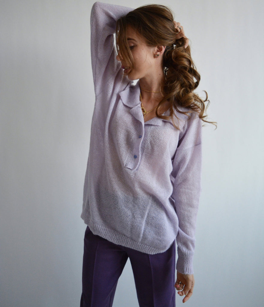 Lilac knitted polo shirt Purple alpaca collar sweater Polo style sweater Merino oversized sweater Retro buttoned sweater Stylish sweater