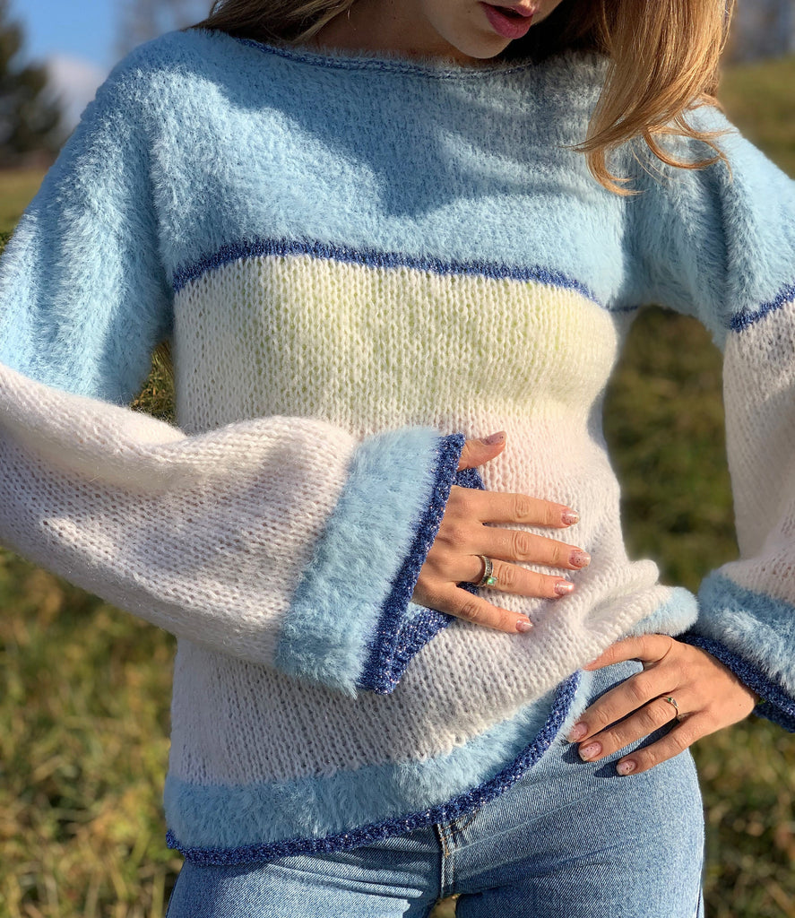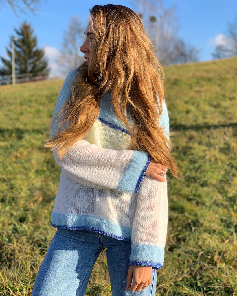 Hello, I'm the one, who won't let you down - white blue mohair sweater.