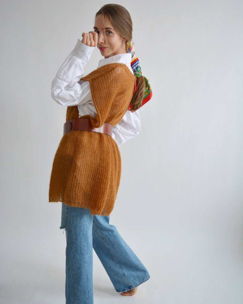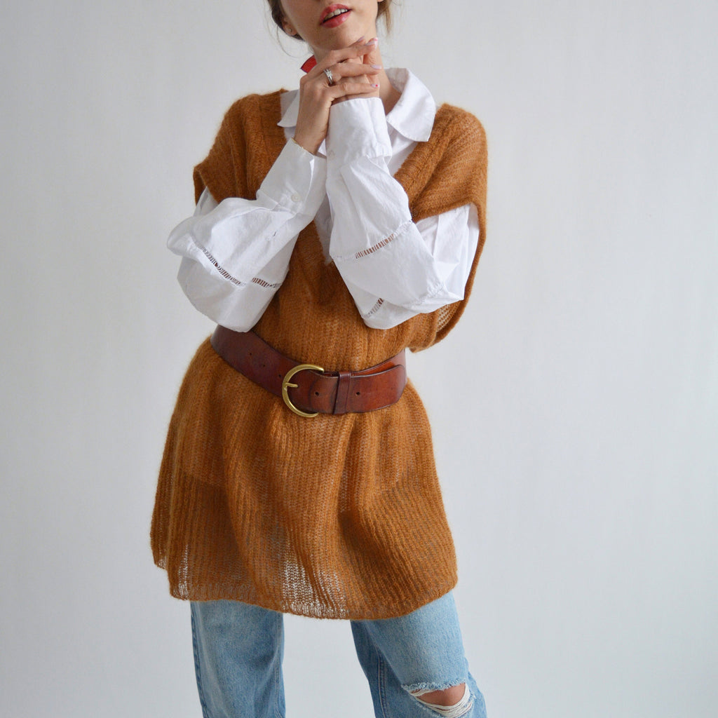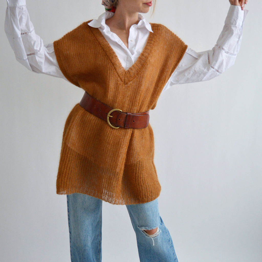Brown mohair sweater vest Loose V neck vest Sleeveless knitted sweater Chunky wool top Stylish waistcoat Handknit vest Long oversized vest