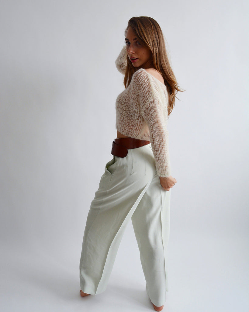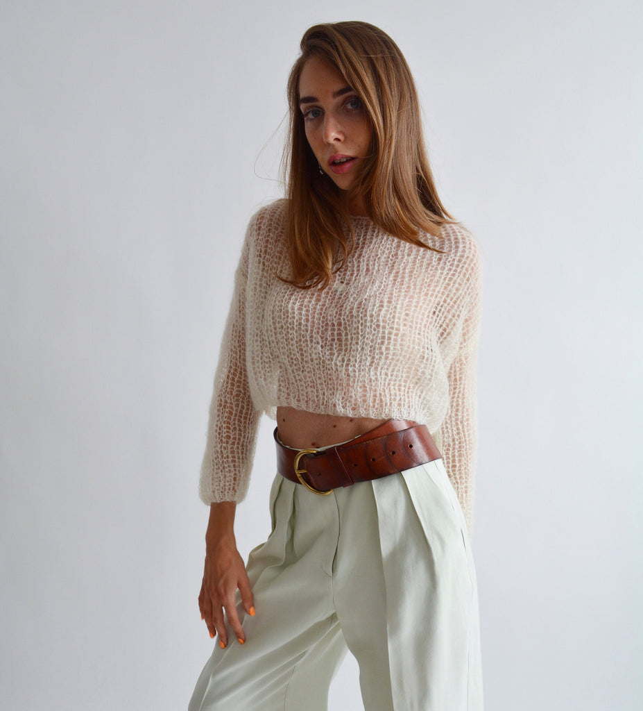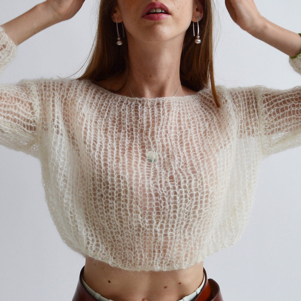 Ivory cropped mohair sweater Sexy light sweater Wedding white sweater Short stylish sweater Mesh handknit sweater Bohemian soft sweater