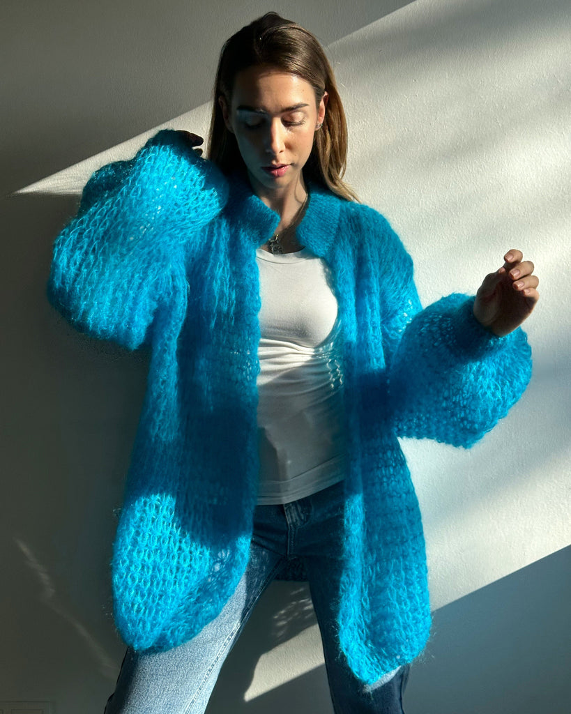 Blue mohair cardigan Short soft cardigan Ballon sleeve cardigan Chunky light cardigan Oversized bohemian cardigan Loose handknit cardigan