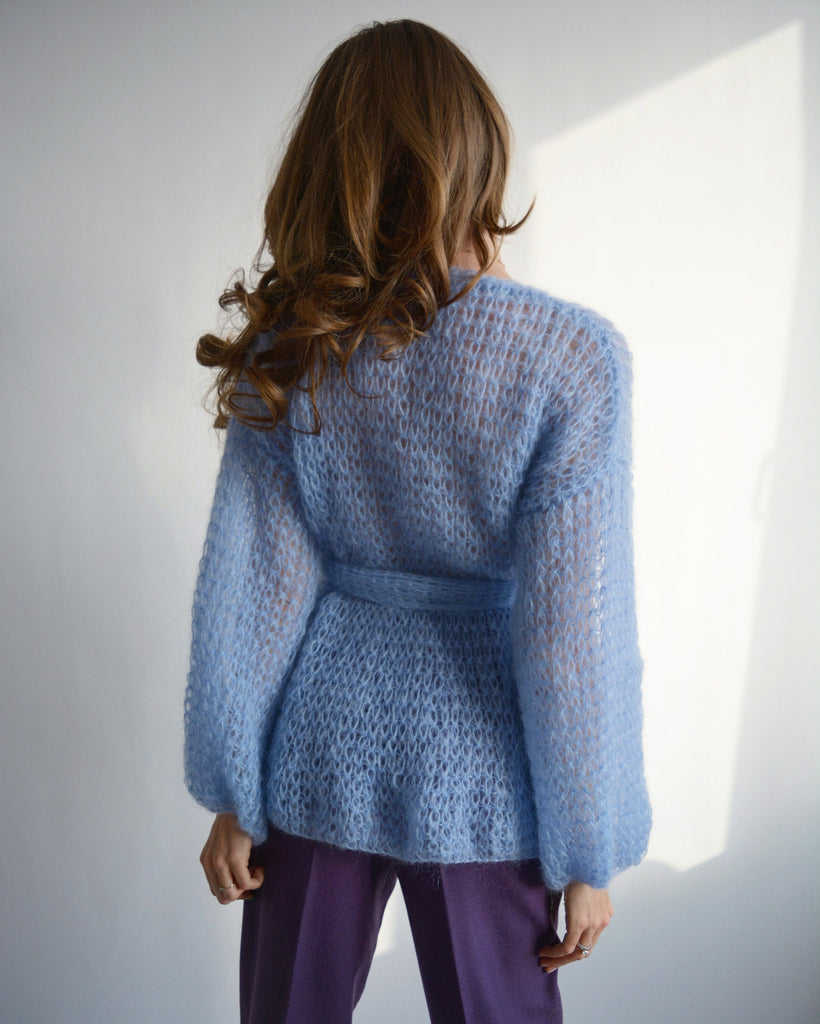 Sky blue mohair cardigan Cropped fluffy cardigan Soft belted cardigan Cardigan with bow Short sexy cardigan Light wrap cardigan