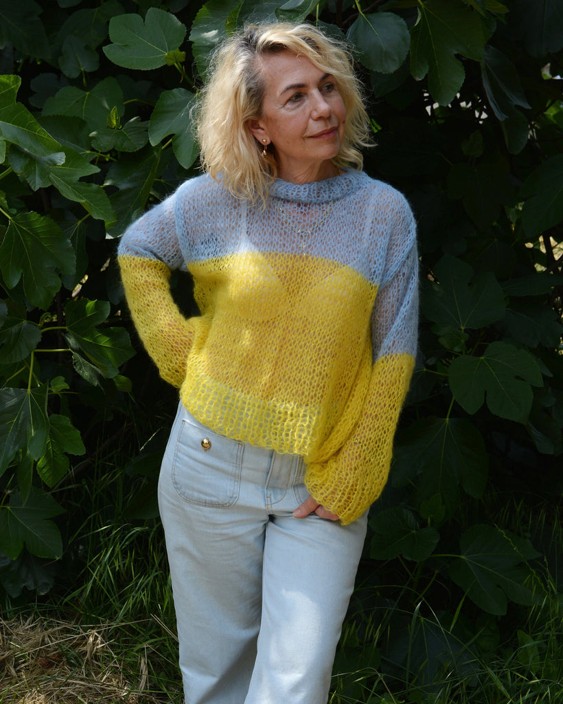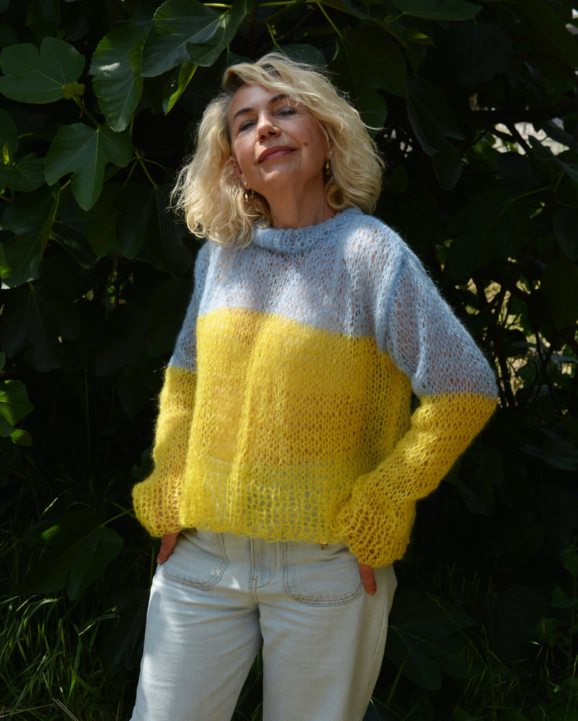Yellow blue Ukrainian sweater Striped mohair patriotic sweater Mesh sexy sweater Handknit stylish sweater Bohemian cropped knitted sweater